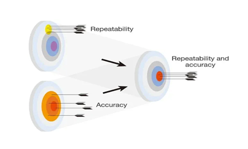 정확도와 반복된 측정값의 변동 정도를 나타내는 반복성으로 표현됩니다.