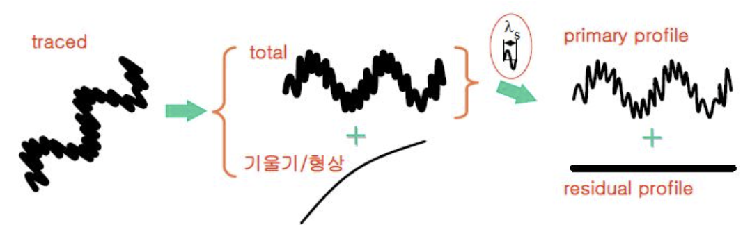 실제 표면 → 측정 → Traced Profile → 필터링 → 프로파일 분리 → 파라미터 계산