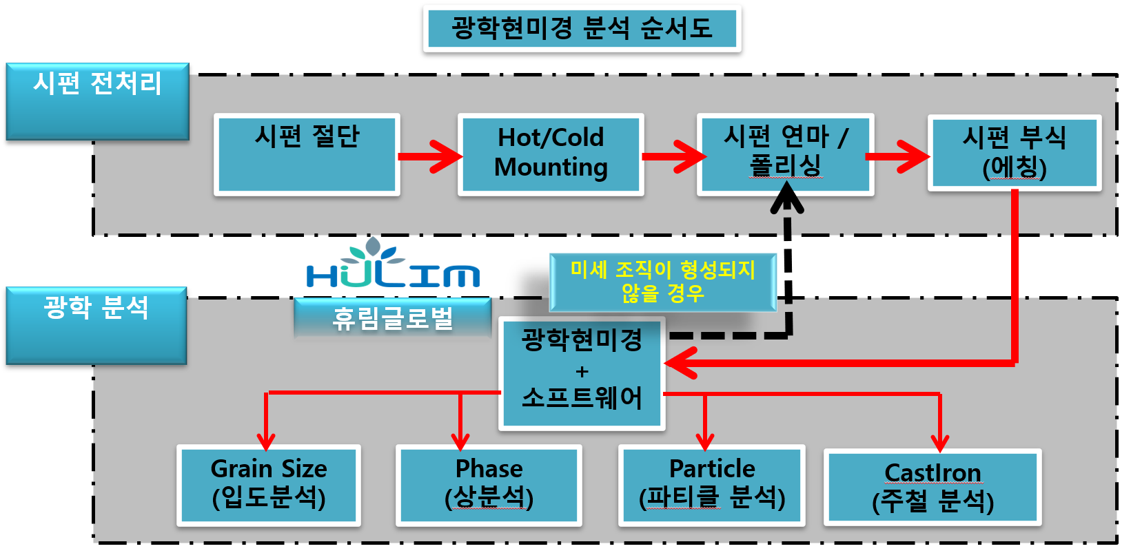 따라서 금속 미세조직을 관찰하기 위해서는 부식(Etching) 과정을 통해 조직 경계를 드러내야 한다.